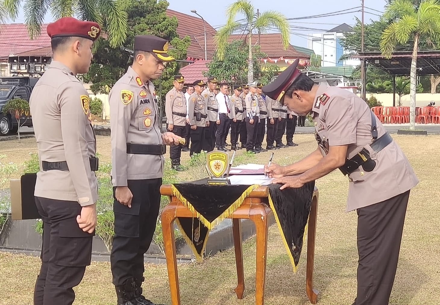 globalinformasi.com || MUSI RAWAS-Kapolres Musi Rawas (Mura), AKBP Andi Supriadi SH, SIK, MH, memimpin langsung Upacara Serah Terima Jabatan (Sertijab), Kabagops, Kasiwas, Kasipropam, Kapolsek Muara Kelingi, Kapolsek Tugumulyo dan Pelantikan Kasat Binmas Polres Musi Rawas, dihalaman upacara Mapolres Mura, Sabtu (3/8/2024).