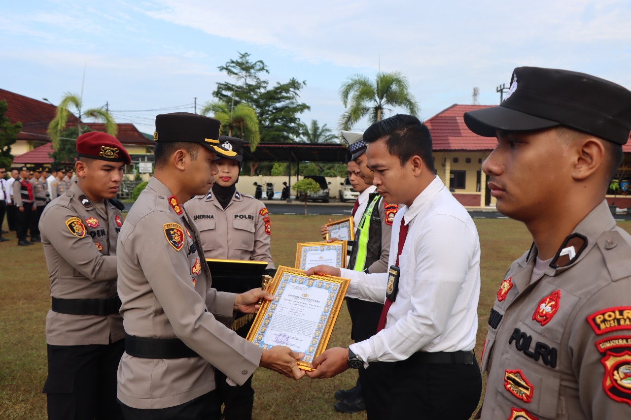 MUSI RAWAS,globalinformasi.com – Kapolres Musi Rawas (Mura), AKBP Andi Supriadi SH, SIK, MH, memimpin langsung apel sekaligus pemberian piagam penghargaan kepada ke 19 personel Polres Mura dan Polsek jajaran, yang berlangsung dihalaman Apel Mapolres Mura, sekitar pukul 07.00 WIB, Senin (9/9/2024).